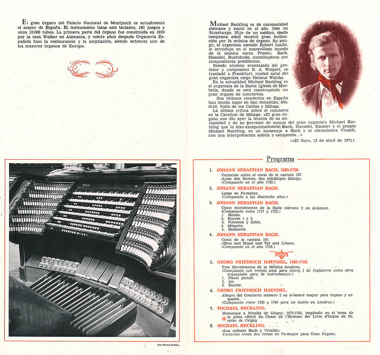Histórica carta de Monseñor Rodrigo Bocanegra, enviada en 1971 como párroco de la Iglesia de Marbella a Michael Reckling que se encontraba en aquel momento en Barcelona por los preparativos de sus dos conciertos en el gran órgano del Palacio Nacional de Montjuich. Más de 2.000 personas acudieron a los dos conciertos para conocer y disfrutar de la impresionante sonoridad este increible instrumento.