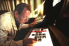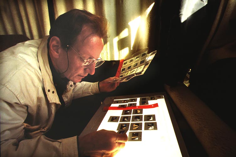 Michael Reckling en 1990 en Ávila, selecionando diapositivas de 35mm de este reportaje